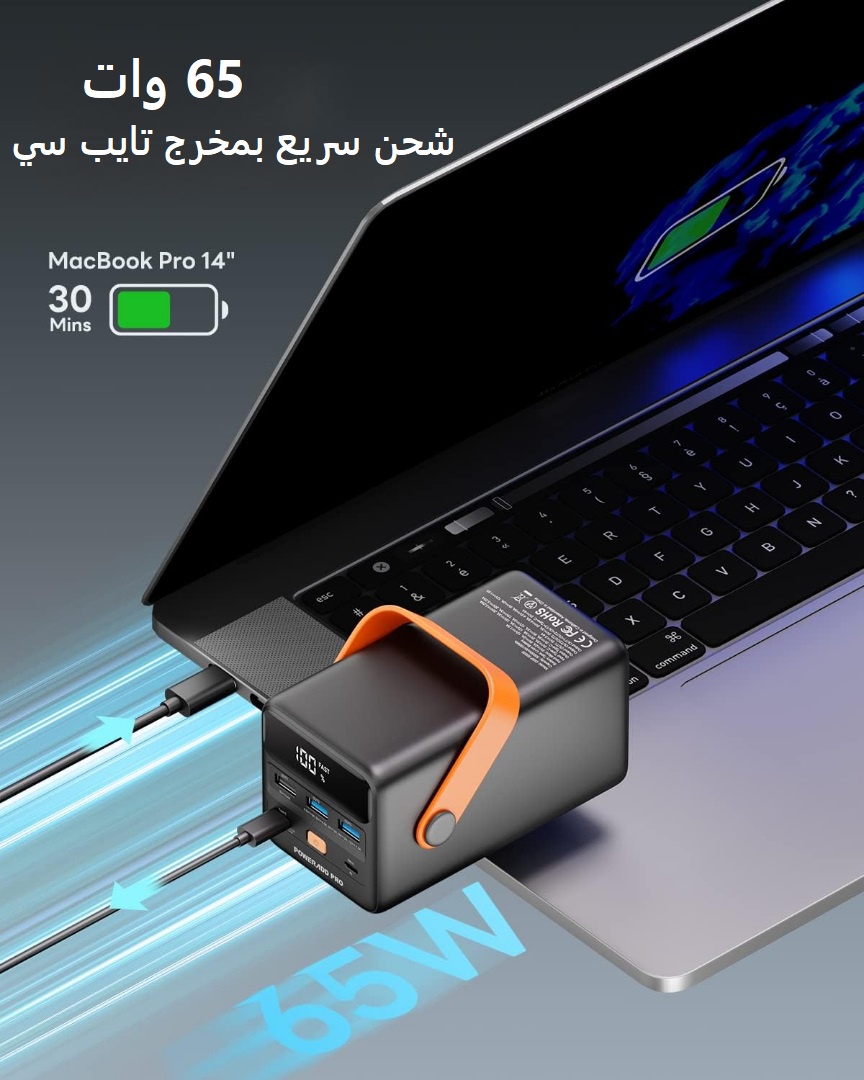 باور بنك 50,000mAh بقدرة 65 واط ⚡ شحن فائق السرعة لـ4 أجهزة وشاشة LED ذكية، تصميم بمقبض وإضاءة للطوارئ مثالي للسفر والرحلات.