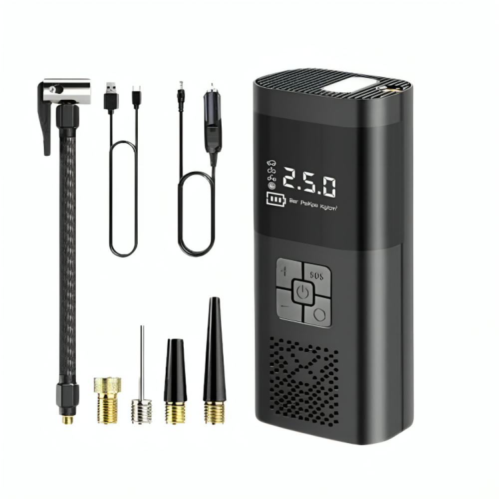 الجهاز يشحن بطريقتين: من خلال تايب سي أو من ولاعة السيارة 🔌، مما يعطيك مرونة سواء كنت في البر أو بالمدينة. البطارية قوية وتكفي لتعبي كفرين كاملين بشحنة وحدة، وتقدر تعتمد عليه لفترة طويلة بدون قلق من الشحن المتكرر. ومع شاشة الـ LED الواضحة، تشوف ضغط الهواء مباشرة بكل دقة وسهولة حتى في الليل أو الظلام.