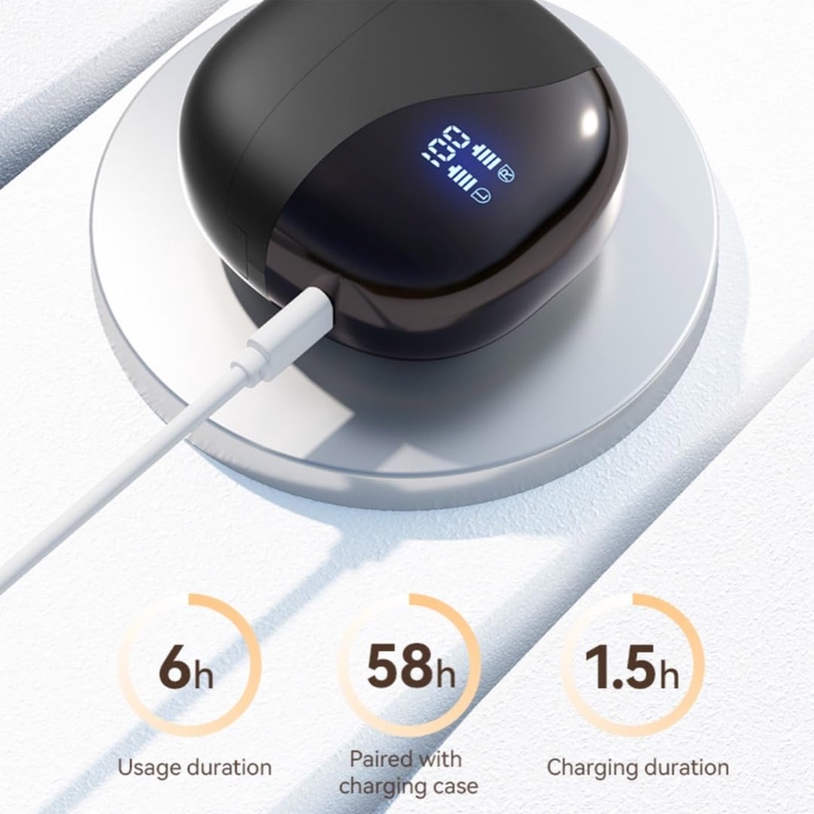 بطارية قوية 6 ساعات متواصلة: تشغل بدون انقطاع، وبعلبة الشحن 300mAh تعيد الشحن السريع في ساعة ونص عبر Type-C. خلصوا هم الشحن الطويل! 🔋⚡